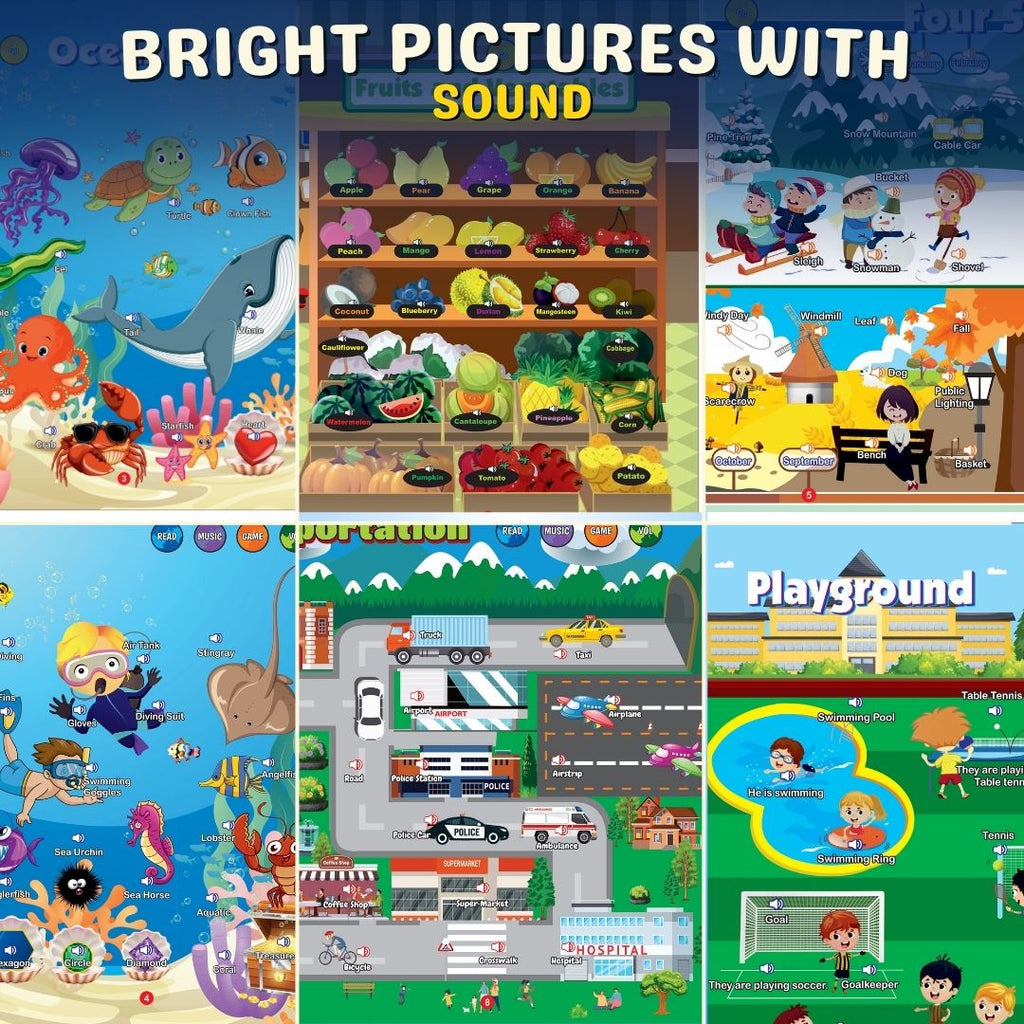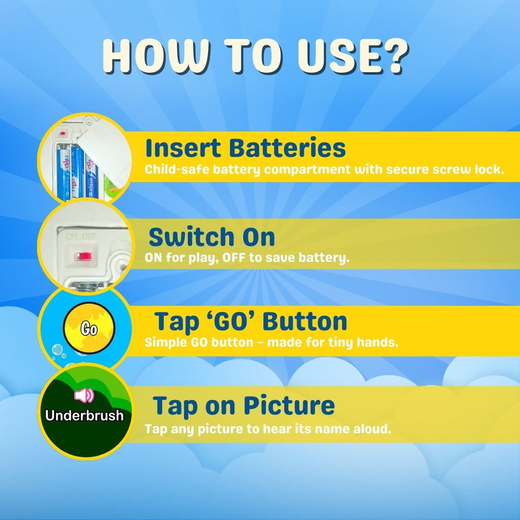 It uses clear, child-friendly audio for every button. Kids can press pictures to hear words and sounds, helping them understand pronunciation, identify objects, and strengthen early speech development.