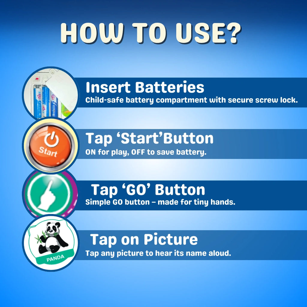 1️⃣ Insert Batteries – Power up the book in seconds.