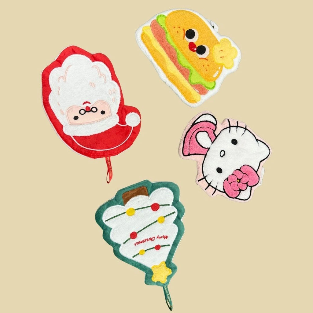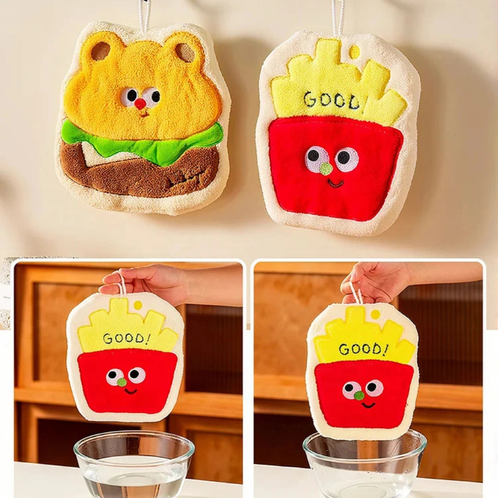 Fun and quirky hand towels shaped like cookies, fries, burgers, and more, featuring adorable facial expressions.