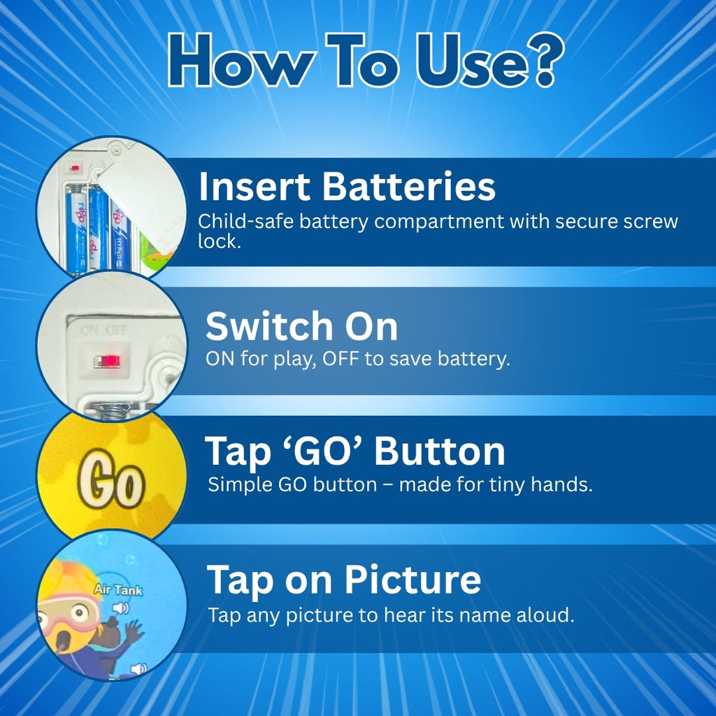 Follow the Given Steps: Insert battery, turn on the button, tap the Go button, and tap pictures to listen to sounds!